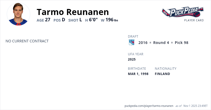 Tarmo Reunanen is a Restricted Free Agent. His last contract was 3 years, $2,427,501 with a cap hit of $809,167 per season. It expired at the end of the 2021-22 season.