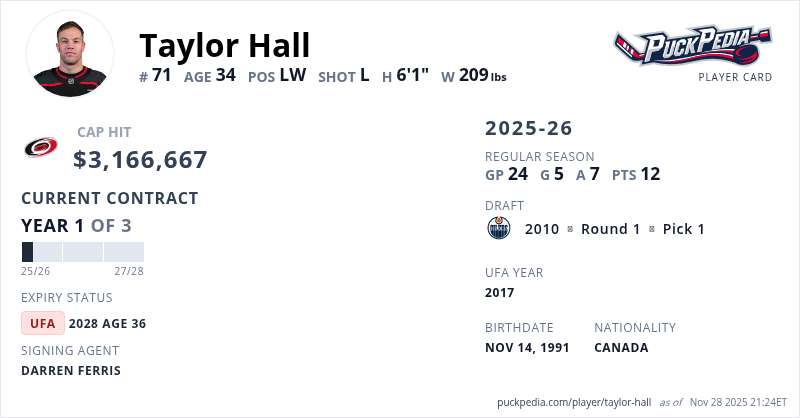 Taylor Hall is signed to a 3 year, $9,500,001 contract with a cap hit of $3,166,667 per season, playing for the Carolina Hurricanes. His contract expires at the end of the 2027-28 season, making Hall an Unrestricted Free Agent.