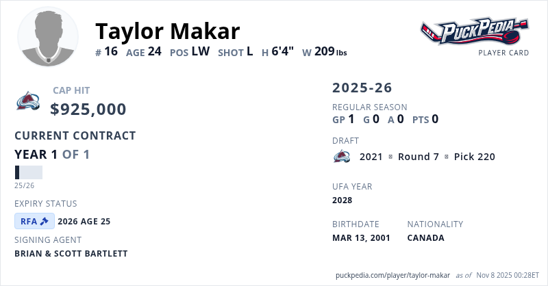 Taylor Makar is signed to a 1 year, $925,000 contract with a cap hit of $925,000 per season, playing for the Colorado Avalanche. His contract expires at the end of the 2025-26 season, making Makar a Restricted Free Agent.
