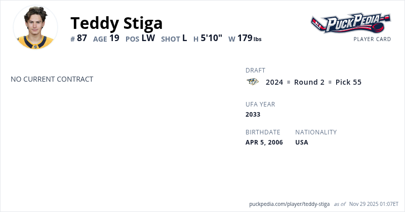 | 2022-23 | 16 | USHL | USNTDP Juniors | 27 | 8 | 4 | 12 | 12 | Playoffs | 3 | 1 | 0 | 1 | 0 | ||||||||||||||||