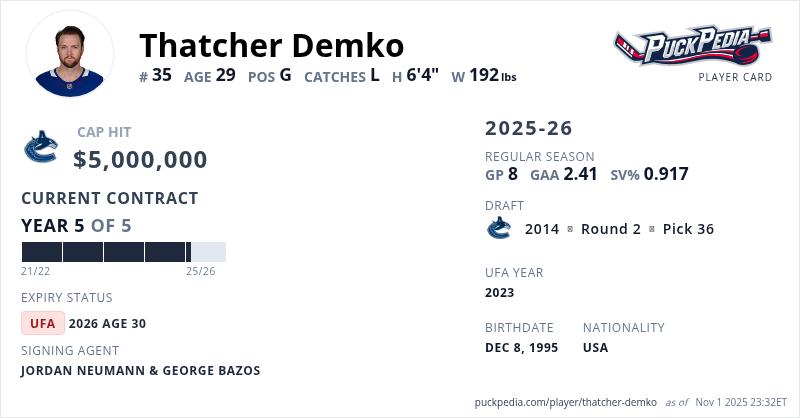 Thatcher Demko is signed to a 3 year, $25,500,000 contract extension with a cap hit of $8,500,000 per season. He plays for the Vancouver Canucks. His next contract begins for the 2026-27 season and expires at the end of the 2028-29 season, making him an Unrestricted Free Agent.