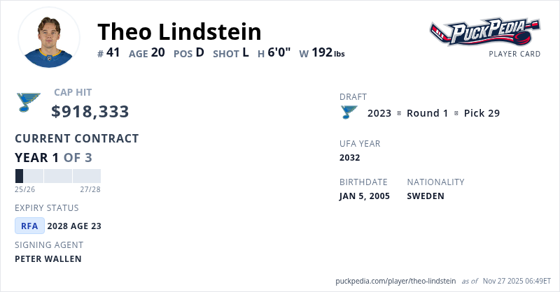 Theo Lindstein is signed to a 3 year, $2,754,999 contract with a cap hit of $918,333 per season, playing for the St. Louis Blues. His contract expires at the end of the 2027-28 season, making Lindstein a Restricted Free Agent.