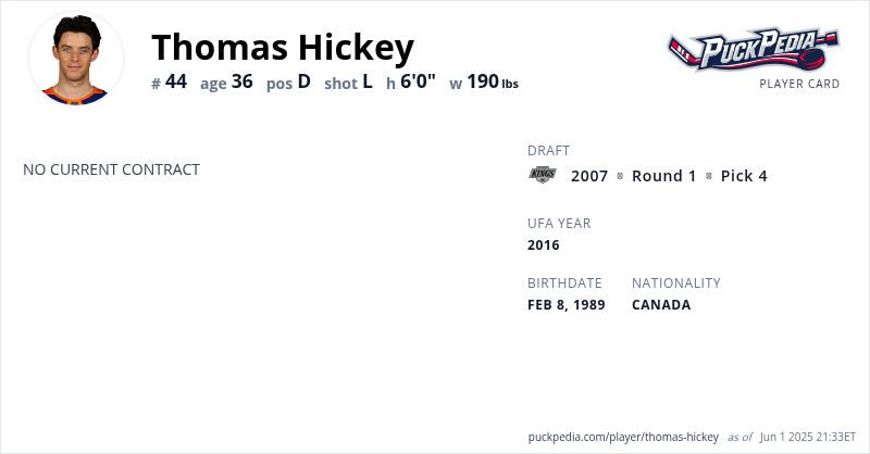 Thomas Hickey is an Unrestricted Free Agent. His last contract was 4 years, $10,000,000 with a cap hit of $2,500,000 per season. It expired at the end of the 2021-22 season.