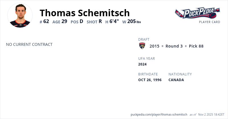 Thomas Schemitsch is an Unrestricted Free Agent (No Qualifying Offer). His last contract was 1 year, $715,000 with a cap hit of $715,000 per season. It expired at the end of the 2019-20 season.