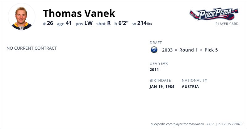 Thomas Vanek is an Unrestricted Free Agent. His last contract was 1 year, $3,000,000 with a cap hit of $3,000,000 per season. It expired at the end of the 2018-19 season.