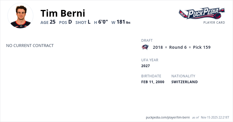 Tim Berni is a Restricted Free Agent. His last contract was 3 years, $2,775,000 with a cap hit of $925,000 per season. It expired at the end of the 2022-23 season.