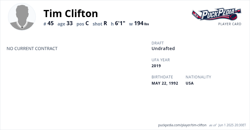 Tim Clifton is an Unrestricted Free Agent. His last contract was 2 years, $1,300,000 with a cap hit of $650,000 per season. It expired at the end of the 2018-19 season.