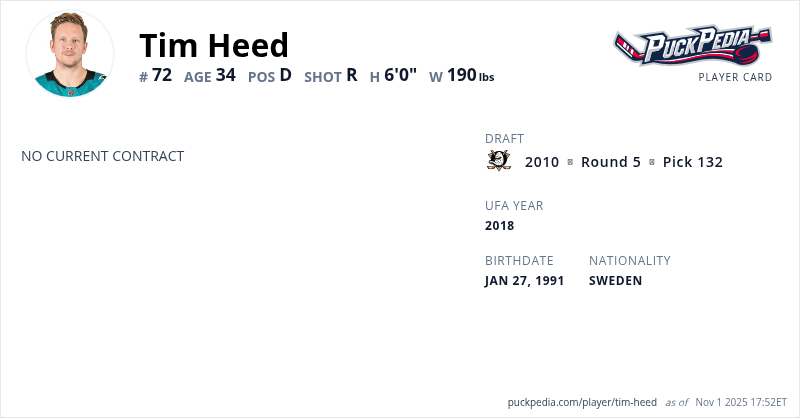 Tim Heed is an Unrestricted Free Agent. His last contract was 1 year, $960,000 with a cap hit of $960,000 per season. It expired at the end of the 2019-20 season.