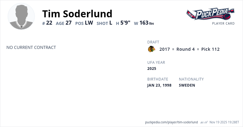 Tim Soderlund is a Restricted Free Agent. His last contract was 3 years, $2,477,499 with a cap hit of $825,833 per season. It expired at the end of the 2021-22 season.