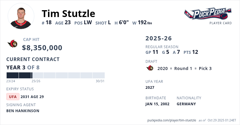 Tim Stutzle is signed to a 8 year, $66,800,000 contract with a cap hit of $8,350,000 per season, playing for the Ottawa Senators. His contract expires at the end of the 2030-31 season, making Stutzle an Unrestricted Free Agent.