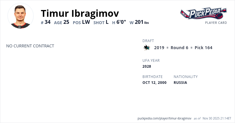 Timur Ibragimov is an Unrestricted Free Agent (No Qualifying Offer). His last contract was 3 years, $2,439,999 with a cap hit of $813,333 per season. It expired at the end of the 2022-23 season.