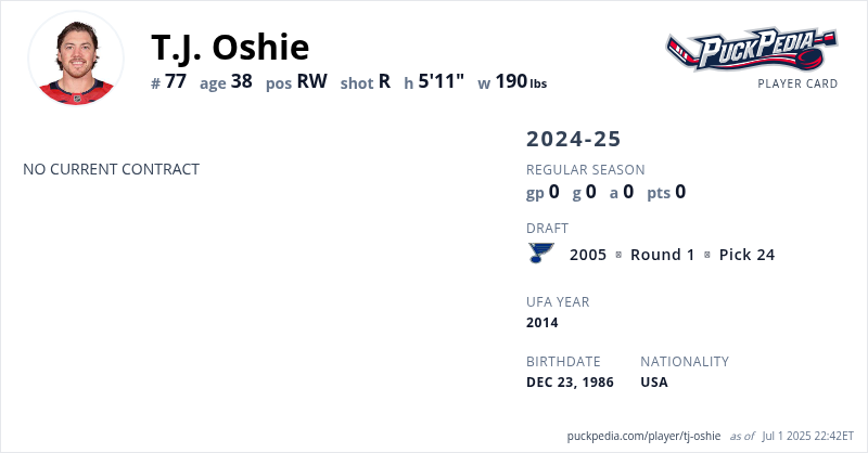 T.J. Oshie is an Unrestricted Free Agent. His last contract was 8 years, $46,000,000 with a cap hit of $5,750,000 per season. It expired at the end of the 2024-25 season.