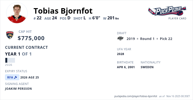 Tobias Bjornfot is signed to a 1 year, $775,000 contract with a cap hit of $775,000 per season, playing for the Florida Panthers. His contract expires at the end of the 2025-26 season, making Bjornfot a Restricted Free Agent.