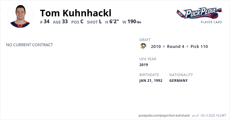 Tom Kuhnhackl is an Unrestricted Free Agent. His last contract was 1 year, $850,000 with a cap hit of $850,000 per season. It expired at the end of the 2019-20 season.
