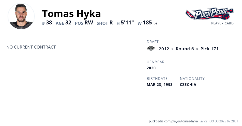 Tomas Hyka is an Unrestricted Free Agent (No Qualifying Offer). His last contract was 1 year, $650,000 with a cap hit of $650,000 per season. It expired at the end of the 2018-19 season.