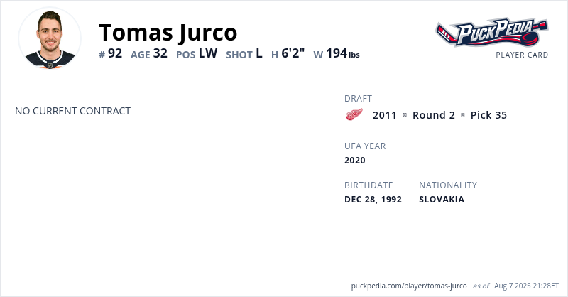 Tomas Jurco is an Unrestricted Free Agent. His last contract was 1 year, $700,000 with a cap hit of $700,000 per season. It expired at the end of the 2020-21 season.