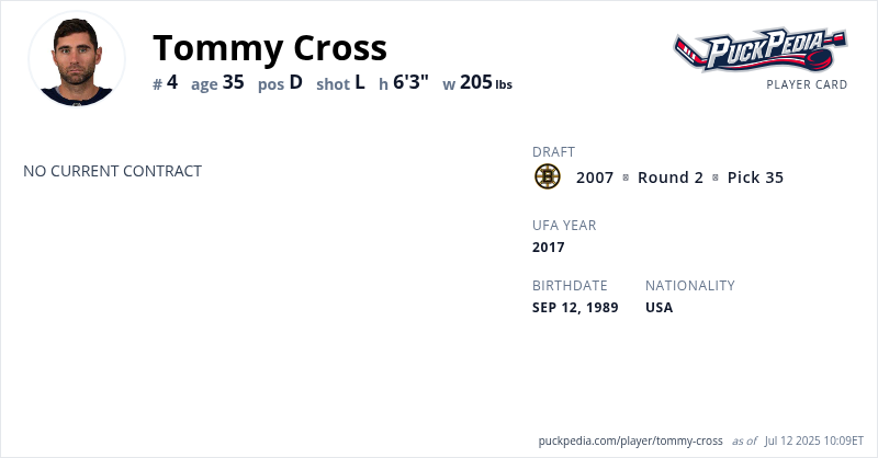 Tommy Cross is an Unrestricted Free Agent. His last contract was 1 year, $750,000 with a cap hit of $750,000 per season. It expired at the end of the 2021-22 season.