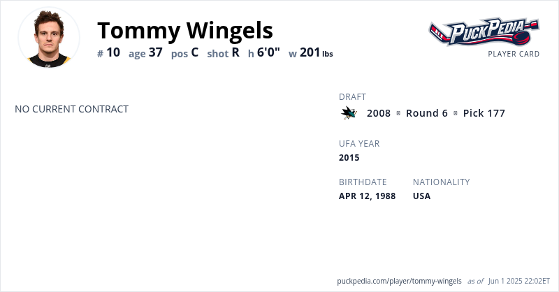 Tommy Wingels is an Unrestricted Free Agent. His last contract was 1 year, $750,000 with a cap hit of $750,000 per season. It expired at the end of the 2017-18 season.
