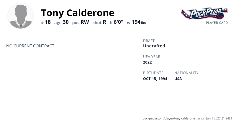 Tony Calderone is an Unrestricted Free Agent (No Qualifying Offer). His last contract was 2 years, $1,535,000 with a cap hit of $767,500 per season. It expired at the end of the 2019-20 season.
