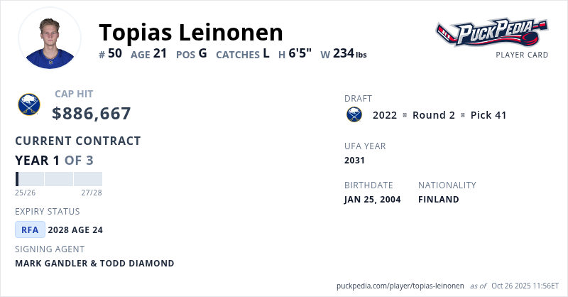 Topias Leinonen is signed to a 3 year, $2,660,001 contract with a cap hit of $886,667 per season, playing for the Buffalo Sabres. His contract expires at the end of the 2027-28 season, making Leinonen a Restricted Free Agent.
