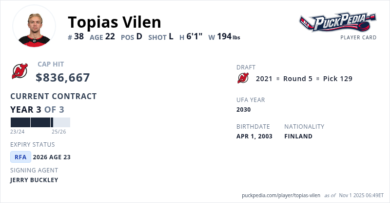 Topias Vilen is signed to a 3 year, $2,510,001 contract with a cap hit of $836,667 per season, playing for the New Jersey Devils. His contract expires at the end of the 2025-26 season, making Vilen a Restricted Free Agent.