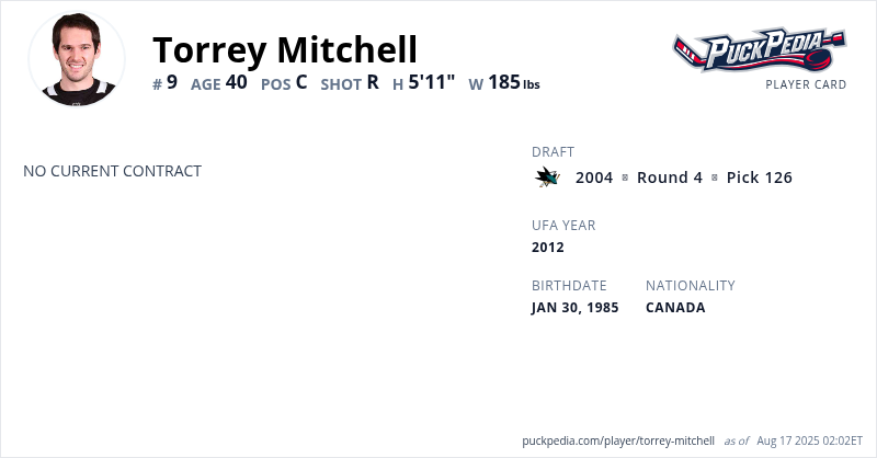 Torrey Mitchell is an Unrestricted Free Agent. His last contract was 3 years, $3,600,000 with a cap hit of $1,200,000 per season. It expired at the end of the 2017-18 season.