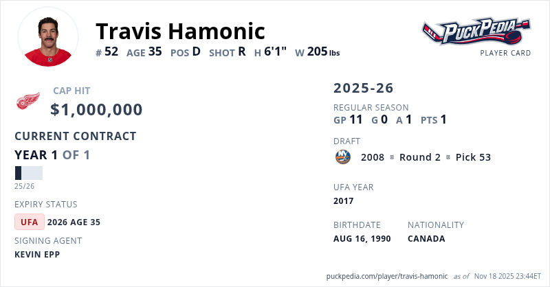 Travis Hamonic is signed to a 1 year, $1,000,000 contract with a cap hit of $1,000,000 per season, playing for the Detroit Red Wings. His contract expires at the end of the 2025-26 season, making Hamonic an Unrestricted Free Agent.