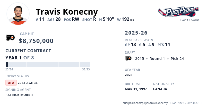 Travis Konecny is signed to a 8 year, $70,000,000 contract with a cap hit of $8,750,000 per season, playing for the Philadelphia Flyers. His contract expires at the end of the 2032-33 season, making Konecny an Unrestricted Free Agent.