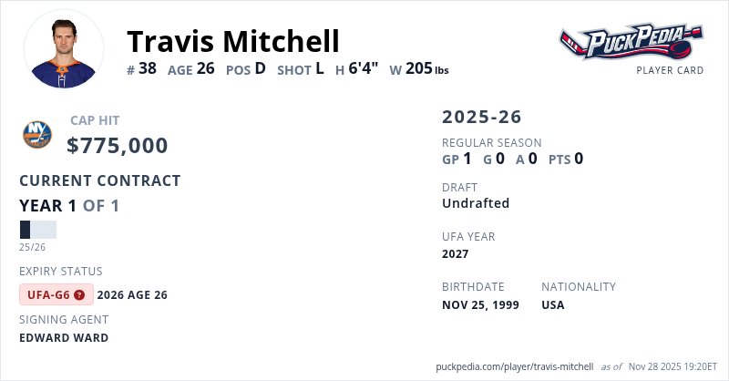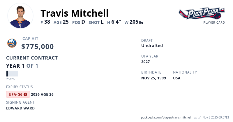 Travis Mitchell is signed to a 1 year, $775,000 contract with a cap hit of $775,000 per season, playing for the New York Islanders. His contract expires at the end of the 2025-26 season, making Mitchell an Unrestricted Free Agent (Group 6).