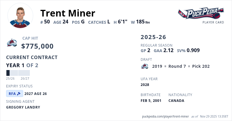 Trent Miner is signed to a 2 year, $1,550,000 contract with a cap hit of $775,000 per season, playing for the Colorado Avalanche. His contract expires at the end of the 2026-27 season, making Miner a Restricted Free Agent.