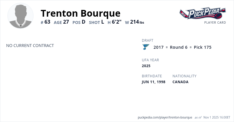 | 2016-17 | 18 | OHL | Owen Sound Attack | 67 | 0 | 11 | 11 | 36 | Playoffs | 17 | 0 | 2 | 2 | 0 | ||||||||||||||||