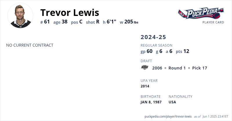 Trevor Lewis is an Unrestricted Free Agent. His last contract was 1 year, $800,000 with a cap hit of $800,000 per season. It expired at the end of the 2024-25 season.