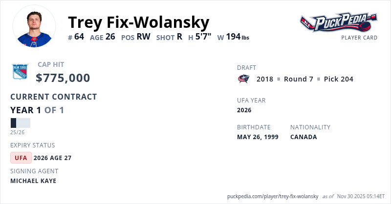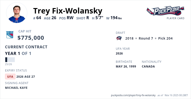 Trey Fix-Wolansky is signed to a 1 year, $775,000 contract with a cap hit of $775,000 per season, playing for the New York Rangers. His contract expires at the end of the 2025-26 season, making Fix-Wolansky an Unrestricted Free Agent.