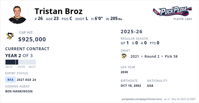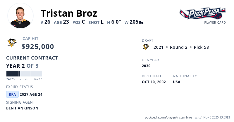 Tristan Broz is signed to a 3 year, $2,775,000 contract with a cap hit of $925,000 per season, playing for the Pittsburgh Penguins. His contract expires at the end of the 2026-27 season, making Broz a Restricted Free Agent.