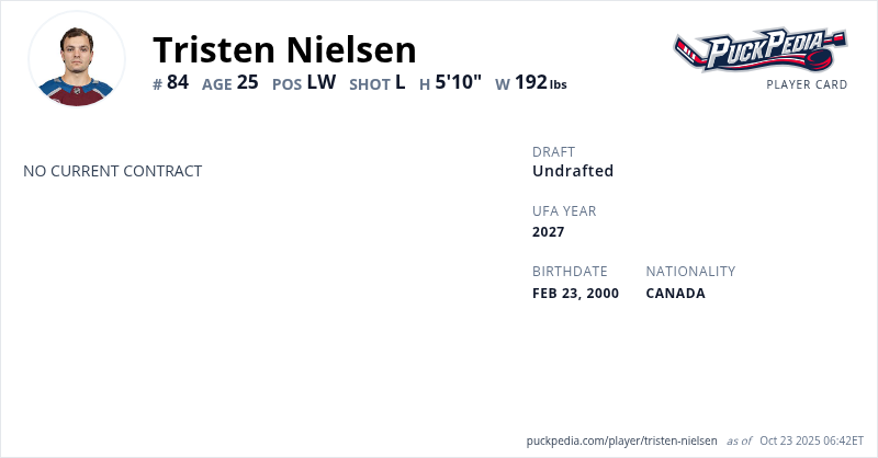 Tristen Nielsen is an Unrestricted Free Agent (No Qualifying Offer). His last contract was 2 years, $1,740,000 with a cap hit of $870,000 per season. It expired at the end of the 2024-25 season.