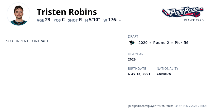 Tristen Robins is an Unrestricted Free Agent (No Qualifying Offer). His last contract was 3 years, $2,392,500 with a cap hit of $797,500 per season. It expired at the end of the 2024-25 season.