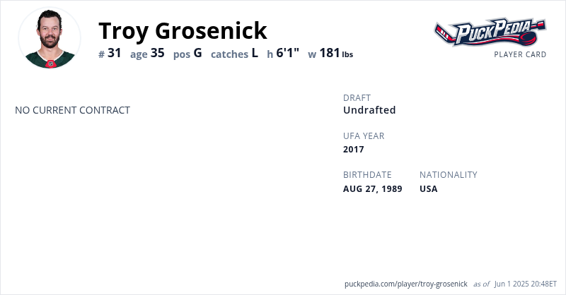 Troy Grosenick is an Unrestricted Free Agent. His last contract was 1 year, $775,000 with a cap hit of $775,000 per season. It expired at the end of the 2024-25 season.