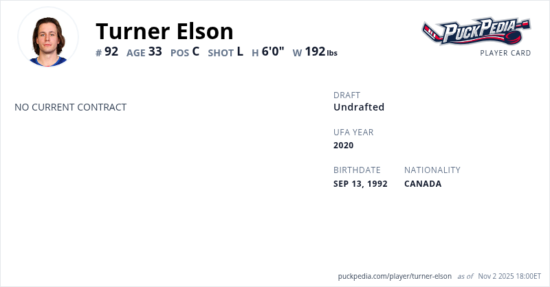 Turner Elson is an Unrestricted Free Agent. His last contract was 2 years, $1,525,000 with a cap hit of $762,500 per season. It expired at the end of the 2023-24 season.