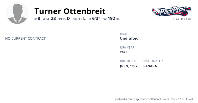 | 2022-23 | 25 | AHL | Iowa Wild | 57 | 4 | 8 | 12 | 59 | Playoffs | 2 | 0 | 0 | 0 | 0 | ||||||||||||||||