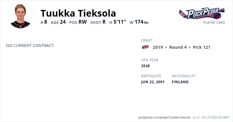 Tuukka Tieksola is an Unrestricted Free Agent (No Qualifying Offer). His last contract was 3 years, $2,469,999 with a cap hit of $823,333 per season. It expired at the end of the 2023-24 season.