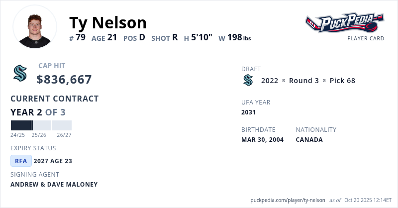 Ty Nelson is signed to a 3 year, $2,510,001 contract with a cap hit of $836,667 per season, playing for the Seattle Kraken. His contract expires at the end of the 2026-27 season, making Nelson a Restricted Free Agent.