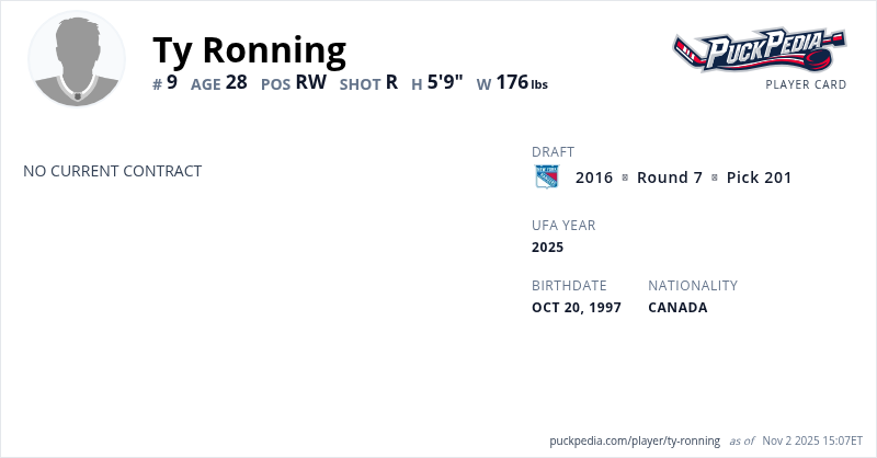 Ty Ronning is an Unrestricted Free Agent (No Qualifying Offer). His last contract was 1 year, $750,000 with a cap hit of $750,000 per season. It expired at the end of the 2021-22 season.
