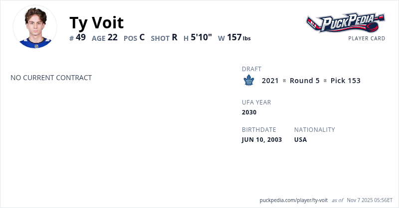 Ty Voit is a Restricted Free Agent. His last contract was 3 years, $2,401,668 with a cap hit of $800,556 per season.