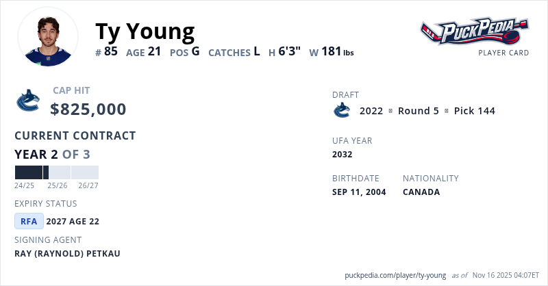 Ty Young is signed to a 3 year, $2,475,000 contract with a cap hit of $825,000 per season, playing for the Vancouver Canucks. His contract expires at the end of the 2026-27 season, making Young a Restricted Free Agent.