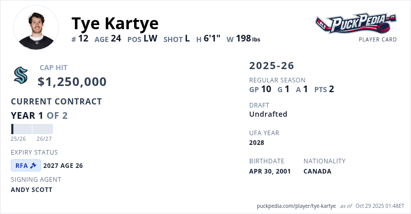 Tye Kartye is signed to a 2 year, $2,500,000 contract with a cap hit of $1,250,000 per season, playing for the Seattle Kraken. His contract expires at the end of the 2026-27 season, making Kartye a Restricted Free Agent.