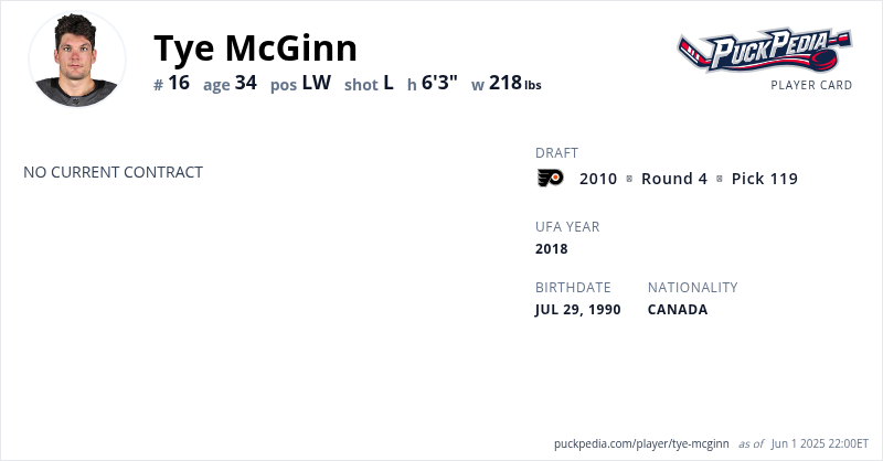 Tye McGinn is an Unrestricted Free Agent. His last contract was 1 year, $650,000 with a cap hit of $650,000 per season. It expired at the end of the 2017-18 season.