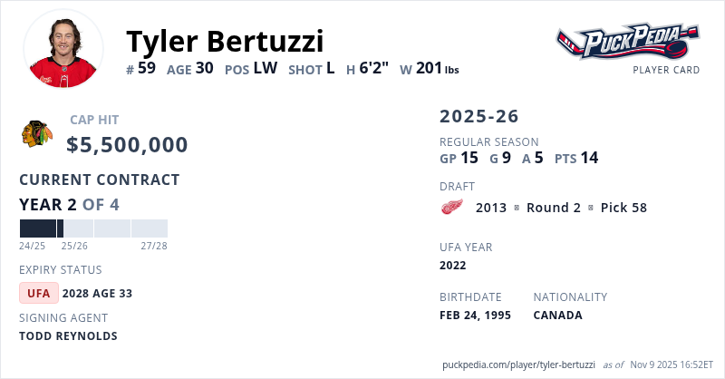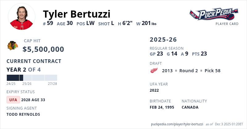 Tyler Bertuzzi is signed to a 4 year, $22,000,000 contract with a cap hit of $5,500,000 per season, playing for the Chicago Blackhawks. His contract expires at the end of the 2027-28 season, making Bertuzzi an Unrestricted Free Agent.