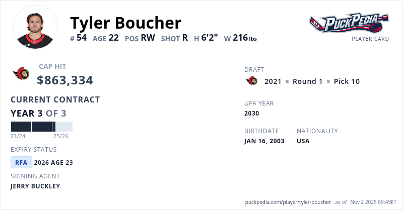 Tyler Boucher is signed to a 3 year, $2,590,002 contract with a cap hit of $863,334 per season, playing for the Ottawa Senators. His contract expires at the end of the 2025-26 season, making Boucher a Restricted Free Agent.