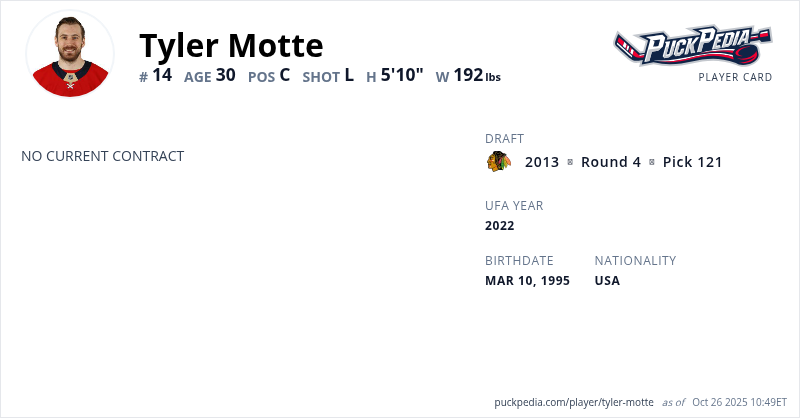 Tyler Motte is an Unrestricted Free Agent. His last contract was 1 year, $800,000 with a cap hit of $800,000 per season. It expired at the end of the 2024-25 season.