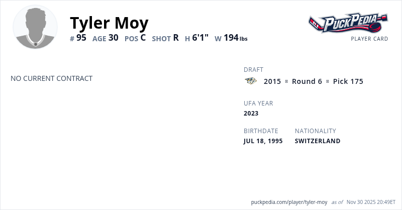 Tyler Moy is an Unrestricted Free Agent. His last contract was 2 years, $1,585,000 with a cap hit of $792,500 per season. It expired at the end of the 2018-19 season.
